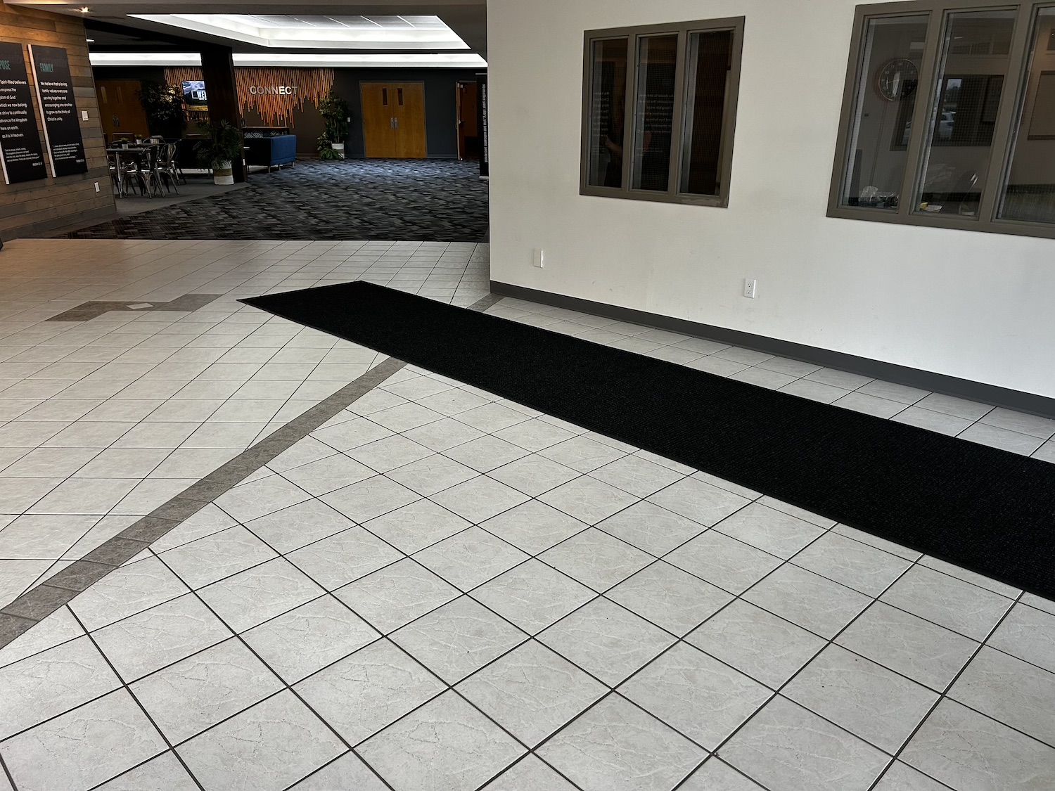 This extra-long entryway runner mat in a church will ensure that little to no soil particles from outside will remain on footwear to damage the carpet in the background.  Click photo to enlarge.